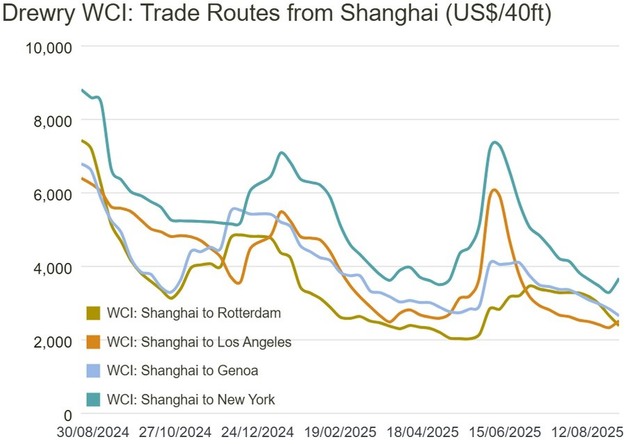 Deze week zijn de spottarieven voor Azië-Europa juist gedaald. Op de route van Shanghai naar Rotterdam was er een daling van 10% ($2.385) en voor Shanghai naar Genua daalde het tarief met 7% ($2.653). Ondanks een gezonde vraag en vertragingen in diverse Europese havens, blijft een overvloed aan scheepscapaciteit de prijzen op deze markt naar beneden drukken. Daarom gaat Drewry uit van een verdere daling van de spotprijzen in de komende weken.