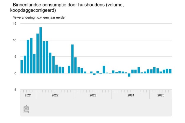 In juli 2025 hebben huishoudens 1,3 procent meer goederen en diensten aangeschaft dan in juli 2024, meldt het Centraal Bureau voor de Statistiek (CBS). Ze kochten zowel meer goederen als meer diensten.