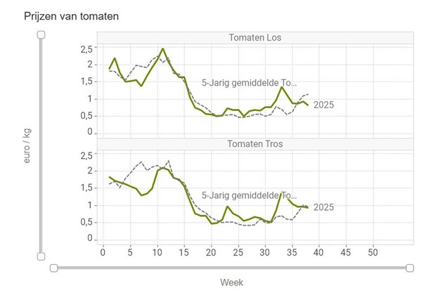 De tomatenprijzen zijn in week 38 licht gedaald: losse tomaten noteerden gemiddeld €0,814/kg (was €0,939), terwijl trostomaten daalden naar €0,936/kg (was €0,969). Dat blijkt uit de VBT-cijfers van deze week.