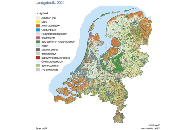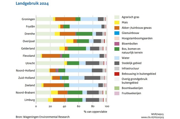 Stedelijke landgebruiksvormen komen met name in de provincies in west Nederland voor. Langs de kust komen veel natuurlijke terreinen voor in de vorm van duinen. In de noordelijke provincies ligt minder stedelijke bebouwing en wordt het landschap gedomineerd door agrarisch landgebruik en meren en plassen. In de oostelijke en zuidelijke provincies ligt een mix van stedelijke en agrarische gebieden, afgewisseld met natuurlijke terreinen en bosgebieden.