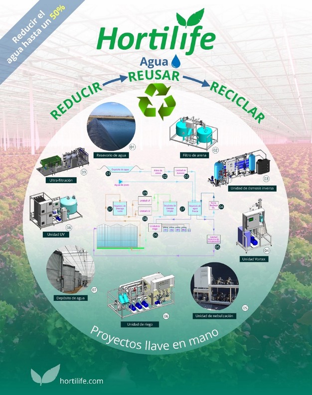 "Hortilife werkt aan de implementatie van systemen die het mogelijk maken om tot 95% van het drainwater te hergebruiken, dankzij recirculatie- en desinfectieprocessen die het mogelijk maken om optimaal gebruik te maken van drainwater en uitgeloogde meststoffen."