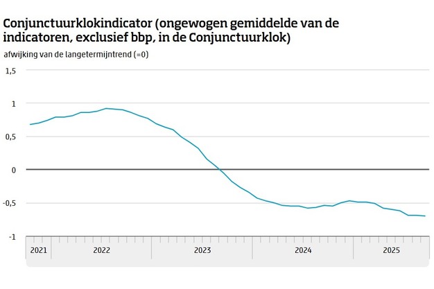 Het conjunctuurbeeld in Nederland was in september vrijwel even negatief als in juli en augustus, meldt het Centraal Bureau voor de Statistiek (CBS). In de Conjunctuurklok van september presteerden 12 van de 13 indicatoren slechter dan hun langjarige trend.