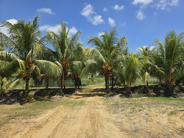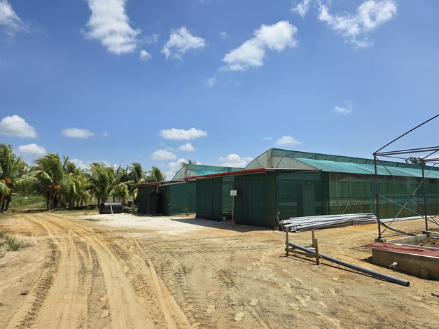 © Pieter Boekhout | GroentenNieuws.nlPalmen achter de kassen en kantoor. Daarachter is de grootschalige teelt van onder andere okra.