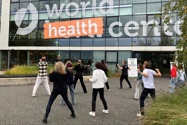 Deze week staat World Horti Center volledig in het teken van gezondheid en bewustwording. Van 6 t/m 10 oktober verandert het kennis- en innovatiecentrum tijdelijk in het 'World Health Center', met een breed programma vol sport, educatie en voeding. De week werd maandagochtend op sportieve wijze geopend door wethouder Anko Goudswaard van Gemeente Westland, die samen met directeur Puck van Holsteijn het aangepaste logo onthulde.