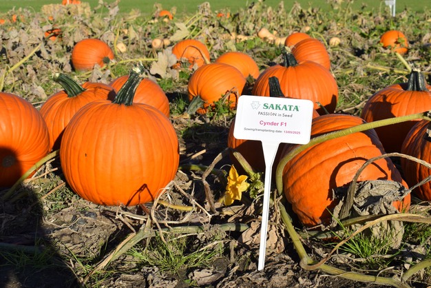 © Marjet Lubbers-Bruijnse | GroentenNieuws.nl Cynder F1 is veredeld op een uniform, groot formaat. Het is de zwaarste pompoensoort in het assortiment (6 tot 8 kg) en daarmee geschikt als Halloweenpompoen, een feest dat steeds populairder wordt.