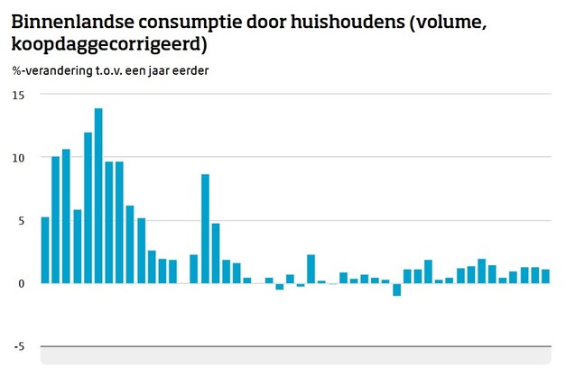Daarnaast namen huishoudens 1,4 procent meer diensten af, vooral op het gebied van vervoer, communicatie en horeca. Diensten vormen ruim de helft van de totale binnenlandse consumptieve bestedingen.