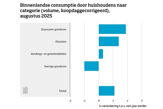 In augustus 2025 hebben Nederlandse huishoudens 1,1 procent meer goederen en diensten gekocht dan in augustus 2024, meldt het CBS. Zowel de aankoop van goederen als diensten nam toe. De cijfers zijn gecorrigeerd voor prijsveranderingen en verschillen in het aantal koopdagen.