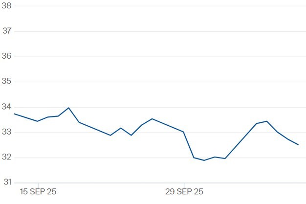 De TTF-gasprijs voor het contract Q1 2026 t/m 10 oktober. Klik hier voor de actuele gascontractprijzen.