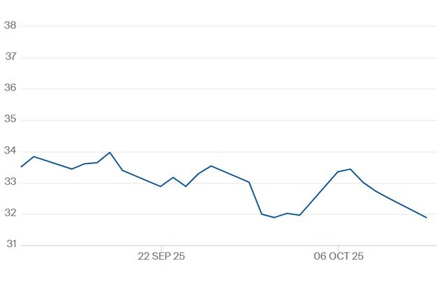 De TTF-gasprijs voor het contract Q1 2026 t/m 13 oktober. Klik hier voor de actuele gascontractprijzen.
