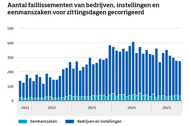 In september 2025 zijn 276 bedrijven failliet verklaard, meldt het Centraal Bureau voor de Statistiek (CBS). Dat is 26 procent minder dan in september 2024, toen 373 bedrijven de boeken moesten sluiten. Ten opzichte van augustus 2025 is het aantal faillissementen vrijwel stabiel (-1 procent).