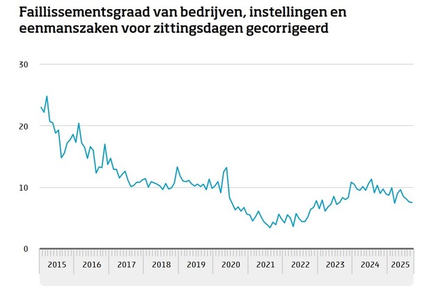Sinds 2015 piekte de faillissementsgraad in maart van dat jaar met 24,8. Daarna zette een daling in, met een dieptepunt van 3,4 in augustus 2021. Na een stijging tot 2024 stabiliseerde de graad en sinds het najaar van 2024 is een lichte daling zichtbaar.