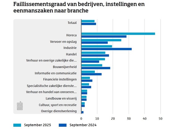 Per sector zijn er flinke verschillen. De horeca blijft het zwaarst getroffen, met 46,7 faillissementen per 100 duizend bedrijven, tegenover 28,8 in september 2024. Voor de agrarische sector, inclusief landbouw en visserij, ligt de faillissementsgraad aanzienlijk lager.
