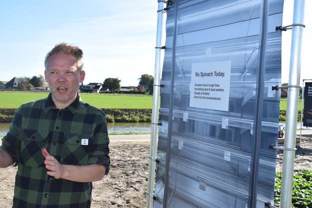 © Marjet Lubbers-Bruijnse | GroentenNieuws.nlJacco Kaarsemaker van KWS voor een poster met een lege koeling waar spinazie in hoort