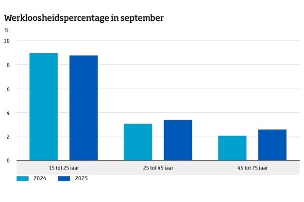 Naar leeftijd uitgesplitst is de werkloosheid vooral gestegen onder 25-plussers. Bij 25- tot 45-jarigen nam het percentage toe van 3,1 naar 3,4 procent, en bij 45-plussers van 2,1 naar 2,6 procent. Jongeren van 15 tot 25 jaar zagen hun werkloosheid juist licht dalen van 9,0 naar 8,8 procent.