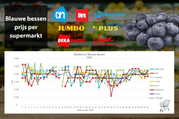 © Supermarktscanner.nl In week 41 heeft alleen Jumbo een actie met blauwe bessen waarbij ze deze aanbieden voor 4,07 euro per 300 gram, nog ruim boven de lage prijzen van Dirk (3,69 euro) en Vomar (3,95 euro). De aanbiedingen bij Plus en DekaMarkt zijn voorbij waardoor de gemiddelde blauwe bessenprijs met 14 cent stijgt.