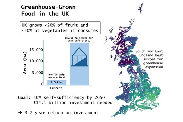 Om in 2050 voor 50% zelfvoorzienend te zijn in kasgeteeld groenten en fruit, moet het VK zijn kascapaciteit verviervoudigen — een investering van circa £14,1 miljard. Toch zijn de vooruitzichten gunstig: de verwachte terugverdientijd ligt tussen de drie en zeven jaar, gedreven door lagere import en groeiende binnenlandse vraag.