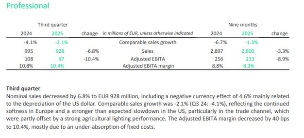Signify maakt vandaag haar cijfers voor kwartaal 3 bekend. "De marktomstandigheden zijn vandaag de dag uitdagend, met een gematigde vraag en prijsdruk in Europa, en een trager dan verwachte Amerikaanse markt", licht CEO As Tempelman, CEO van Signify toe. "In de professionele sector bleven we goed presteren in de projectactiviteiten, connected verlichting en specialistische verlichting, zoals voor de agrarische sector. Zowel de professionele als de consumentenactiviteiten boekten solide marges"