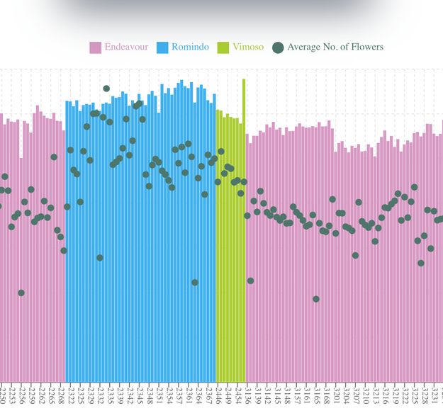 Een voorbeeld van het aantal bloemen en de gemiddelde hoogte van de hoogste tros per rij
