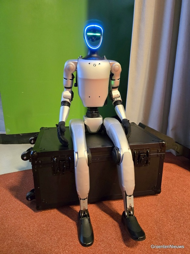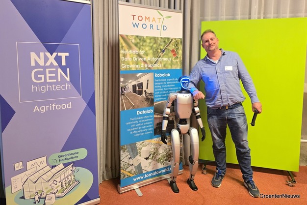 In de hoek van de zaal stond de humanoid al die tijd netjes te wachten. Martijn Lukaart van Look-E vertelde aan de zaal met een dertigtal bezoekers, waaronder ook enkele vruchtgroente- en siertelers van wie een enkeling zelfs uit de regio Venlo gekomen was, meer over de reden om met de Chinese techniek te werken.