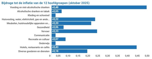 In België kwam de grootste bijdrage aan de inflatie van "Voeding en alcoholvrije dranken" (0,48 procentpunt). "Hotels, restaurants en cafés" hadden een positieve impact van 0,26 procentpunt, terwijl "Huisvesting, water en energie" juist druk op de inflatie uitoefenden (-0,16 procentpunt). Voor diensten steeg de inflatie naar 3,62%, terwijl huur nagenoeg stabiel bleef op 3,99%. Voedingsmiddelen inclusief alcoholische dranken noteerden 2,68%, lager dan in september.