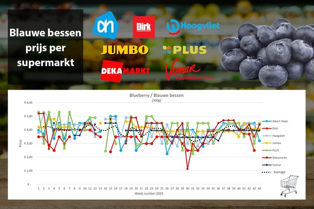 Hoewel Albert Heijn blauwe bessen met een aanbieding van 4,49 naar 3,19 euro in de kijker zet, zijn er in week 44 verder geen acties met blauwe bessen. Bij Dirk ontbreken blauwe bessen in het schap. De gemiddelde blauwe bessenprijs gaat weer omhoog, stijgt 38 eurocent en komt uit op 4, 08 euro.