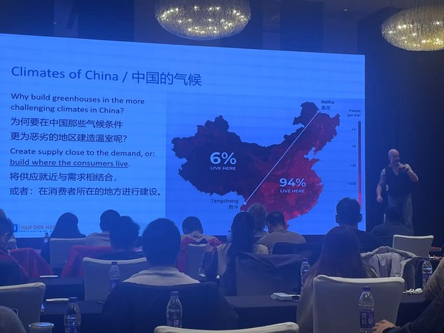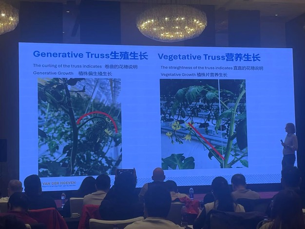 Godfried Dol, met ervaring in landen als Australië en Saoedi-Arabië, deelde uitgebreide praktische kennis over klimaatbeheersing. Aan de hand van foto's illustreerde hij beoordelingstechnieken en acties voor het beheer van zowel vegetatieve als generatieve productiefasen. Hij merkte op dat veel Chinese telers overstappen van conventionele naar semi-gesloten kassen en dat tijdens dit proces veel kritieke details zorgvuldig moeten worden overwogen.