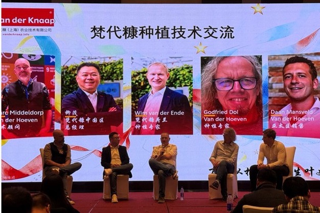 © Luo (Cathy) Rong | GroentenNieuws.nlDe sprekers (van links naar rechts): Marc Middeldorp (Van der Hoeven), Liu Mao (Van der Knaap), Wim van der Ende (Van der Knaap), Godfried Dol (Van der Hoeven) en Daan Mansveld (Van der Hoeven).