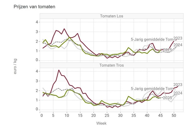 Steeds meer onbelichte teelten zijn gestopt. Sommige tomatentelers trekken, al dan niet met herfsttomaten, nog wel even door. De middenprijs die dat telers bij het VBT oplevert is 1,24 euro per kilo voor trostomaten en 1,10 voor losse tomaten, zo blijkt uit een overzicht voor week 45.