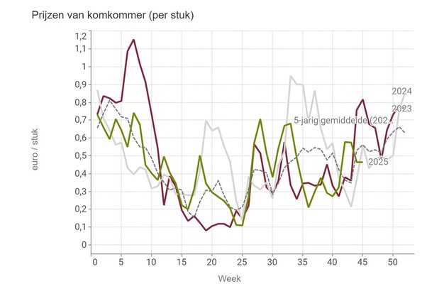 De middenprijs voor komkommer is afgelopen week weer onder het vijfjarig gemiddelde gezakt. De middenprijs komt over week 45 uit op 46 eurocent per stuk.
