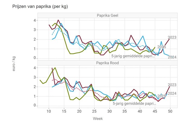 De lokale paprikateelt is ook zo goed als klaar. De laatste paprika's leverden 1,01 euro voor rood en 1,20 euro per kilo voor geel.