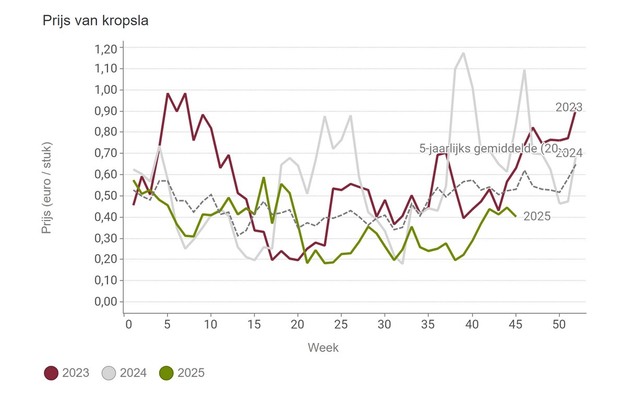 De middenprijs voor kropsla blijft laag. Over week 45 komt de middenprijs uit op 40 eurocent per stuk.