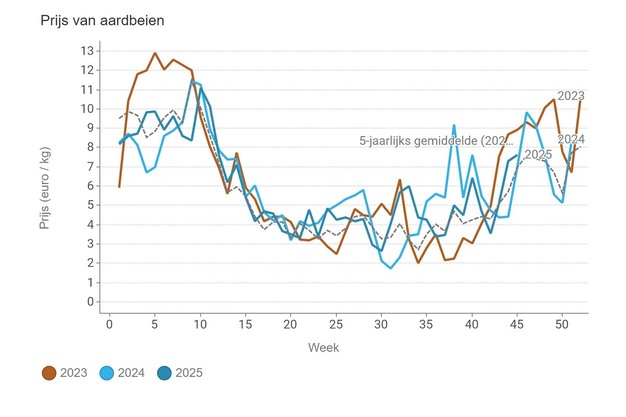 Van alle serreteelten die momenteel bezig zijn, zijn het aardbeientelers die de hoogste kiloprijzen noteren. 7,61 euro per kilo voor aardbeien is een bovengemiddelde prijs.