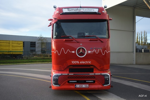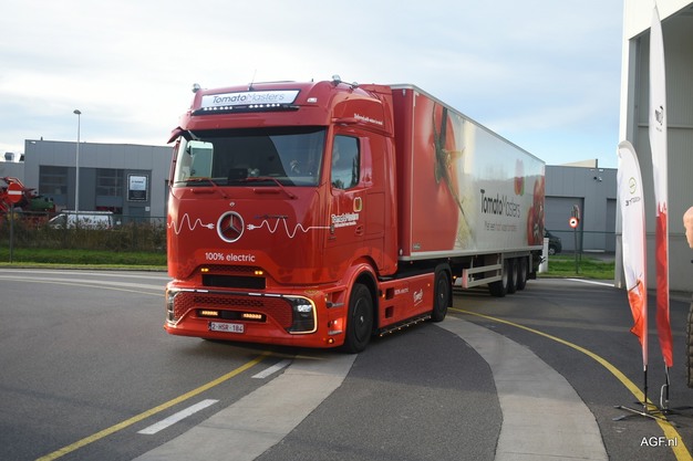 Tholen - Hij rijdt vandaag voor het eerst tussen de teeltlocatie van Tomato Masters en de sorteer- en verpakkingslocatie van Tomeco in Hoogstraten. Op de ochtend van 12 november presenteerden Tomeco, Tomato Masters en Coöperatie Hoogstraten haar nieuwe volledig elektrische Mercedes Benz E-Actros. "Deze vrachtwagen is de eerste elektrische vrachtwagen in België die wordt ingezet tussen een tuinbouwbedrijf en een coöperatie, en niet door een transportfirma. Voor ons is transport geen kernactiviteit. Het gaat enkel om het vervoer van product. Dat maakt deze stap bijzonder", vertellen Tom Vlaeminck (Tomato Masters) en Franky Van Looveren (Tomeco).