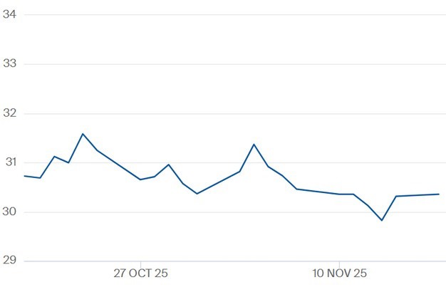 TTF-gasprijs voor het contract Cal 2026 t/m 17 november 2025. Klik hier voor de actuele gascontractprijzen.