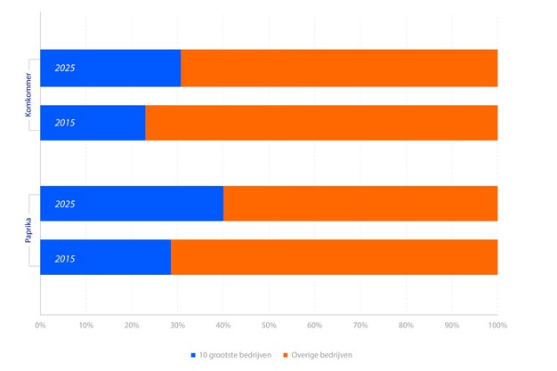 Het areaal bij de tien grootste bedrijven met paprika bedraagt in 2025 volgens gegevens van RaboResearch ongeveer 40% van de oppervlakte waarop paprika wordt geteeld in Nederland. Dat is 652 hectare met een gemiddelde van 65 hectare per bedrijf. Het gemiddelde areaal van de overige 193 bedrijven bedraagt ongeveer 5 hectare glas per bedrijf. Natuurlijk is soms de concentratiegraad bij de diverse kleuren nog veel groter.