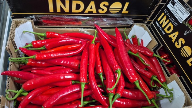 "Zo liepen de paprikaprijzen afgelopen week op in Spanje en dat werd tot afgelopen donderdag ook redelijk betaald, maar inmiddels lijken de klanten er geen trek meer in te hebben. Prijzen liggen rond de 16-17 euro voor de rode en 14-15 euro voor de groene paprika's. Aanbod is er echt niet gek veel, maar de tripsproblemen hebben wel zijn weerslag op de kwaliteit en niemand durft een voorraad aan te leggen, zeker niet met deze prijzen."