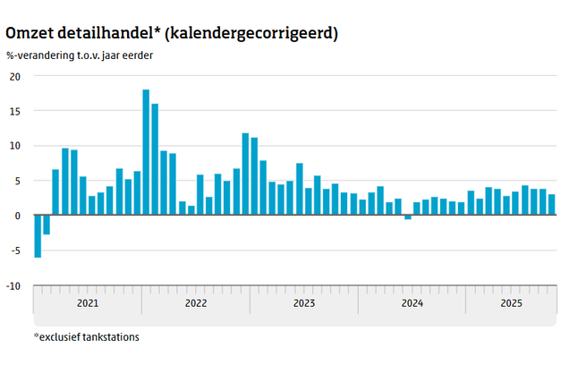 De detailhandel realiseerde in oktober 2025 3,1 procent meer omzet dan in dezelfde maand een jaar eerder. Het verkoopvolume steeg met 1,6 procent. De groei is kalendergecorrigeerd; zonder die correctie kwam de omzetgroei uit op 3,8 procent.