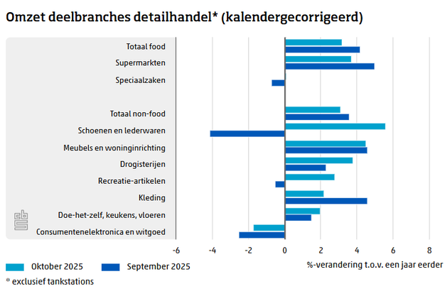 De non-foodsector groeide in oktober met 3,1 procent, vergelijkbaar met de foodsector. Vooral winkels in schoenen en lederwaren (5,6 procent), meubels en woninginrichting (4,5 procent) en drogisterijen (3,8 procent) deden goede zaken. De omzet van winkels in consumentenelektronica en witgoed bleef een aandachtspunt, met een daling van 1,7 procent. Ook drogisterijen zitten opnieuw in de plus. De brede groei in non-food geeft aan dat consumentenuitgaven zich in het najaar stabiliseren.