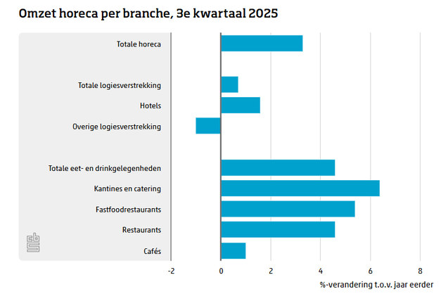 Binnen de sector deed vooral de categorie eet- en drinkgelegenheden het goed. Deze bedrijven — waaronder restaurants, cafés, fastfoodlocaties en catering — realiseerden gezamenlijk 4,6 procent meer omzet dan in het derde kwartaal van 2024. Kantines en cateraars boekten met 6,4 procent de sterkste groei. Fastfoodrestaurants groeiden met 5,4 procent, restaurants met 4,6 procent en cafés met 1 procent.