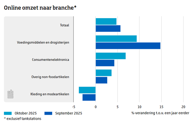 Voor de foodsector noteerden de onlinekanalen eveneens groei. De onlineomzet van winkels in voedingsmiddelen en drogisterijen lag hoger dan in oktober 2024. Daarmee zet de verschuiving naar online bestellingen in food door, al groeit deze categorie minder explosief dan in de coronajaren.