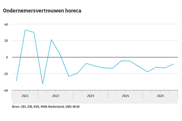 Hoewel de omzet in de horeca blijft stijgen, zijn ondernemers nog altijd voorzichtig. Het ondernemersvertrouwen in de sector kwam in het vierde kwartaal uit op -8,4, een verbetering ten opzichte van -13,2 in het derde kwartaal. Horecaondernemers zijn vooral minder negatief over het economisch klimaat voor de komende drie maanden, maar per saldo blijft het sentiment onder het nulpunt hangen.