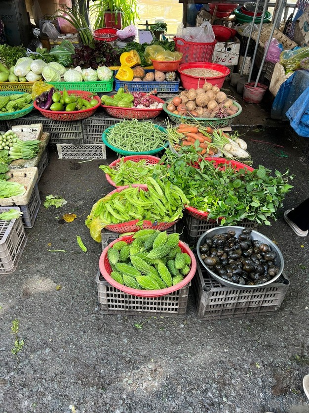 Halverwege de tocht hebben we op een groepje boten de marktproducten bekeken. Hier zien we rijst, vis, groenten, maar ook supermarktproducten. Mensen vanuit het Mekong gebied komen hier naartoe om producten te verkopen, maar ook om spullen weer mee terug te nemen.