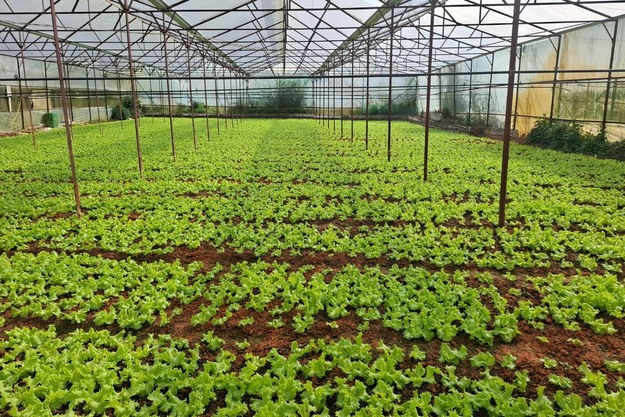 Het telen op deze zware natte grond lijkt goed te gaan. Alles groeit hier, ook het onkruid. Schouder aan schouder telen ze hier verschillende soorten sla, bloemen, aardbeien, tomaten en paprika's. De kastypes zijn zelfgemaakte kassen met plastic dek. Pootafstand 2 x 6m, goothoogte ongeveer 3 meter. Poten en spanten zijn gelast en de nok is overstekend open.