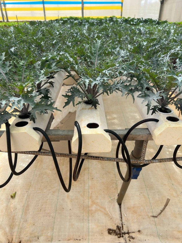 In de kassen is geen verwarming. Er is dus ook geen buisrailsysteem voor transport. De planten, tomaat, komkommer en paprika, groeien op kokoszakken. Elke kokoszak is voorzien van 2 druppelaars.