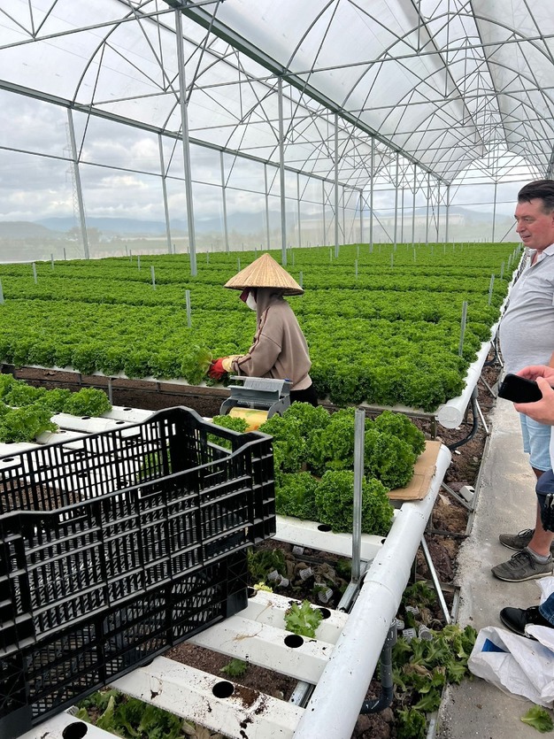 Vandaag staat het bezoek naar Da Lat Has farms Greens op de planning. Hasfarm is het grootste tuinbouwbedrijf in Da Lat. Aangekomen op het bedrijf worden we ontvangen door Khanh Trang. Het valt ons op dat we op de bedrijven meestal worden ontvangen en rondgeleid door vrouwen. Wij vragen na waarom dat zo is. Als reden geeft men aan dat vrouwen krachtiger zijn dan mannen.