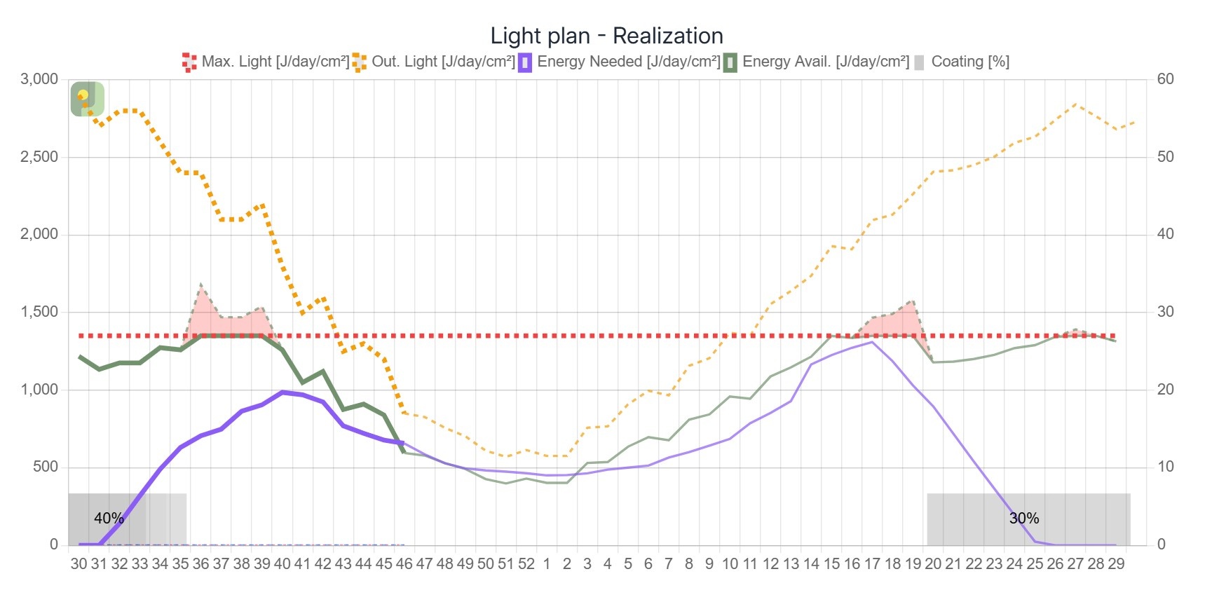 Op momenten met veel licht passen telers krijt of coating toe op hun kas. Hoeveel krijt of coating er nodig is, en wanneer precies, dat is iets wat veel telers nog op gevoel of ervaring doen, ziet Martijn. "Als je in ProJoules de data voor etmaaltemperaturen en licht goed hebt staan, kun je goed zien hoeveel krijt of coating er nodig is, en wanneer."