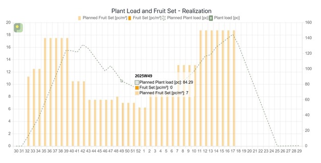 Nog een voorbeeld, uit Turkije deze keer. Daar is het zomers erg zonnig. Op dat moment planten tomatentelers hun teelt om de winter mee door te telen. "Dat doen ze dan met als stengelafstand 3,5. Dat kan, maar niet als je de winter door wilt telen en de hoeveelheid licht steeds verder afneemt. Het gewas verzwakt dan te veel. Als vervolgens in januari het licht weer toeneemt, dan is het gewas eigenlijk te zwak om daarmee om te gaan. De productie valt dan tegen. In ProJoules kun je dat heel duidelijk zien aan de lijnen die in het teeltplan staan."