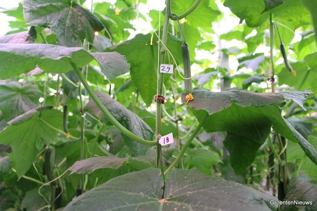 Wat viel op? Eigenlijk niet zoveel, en dat is juist positief. De LED-lampen gingen af en toe aan en uit. Wie iets beter kijkt, ziet het resultaat van een aangepast snoeibeleid, maar los daarvan toch bovenal een gezonde komkommerteelt.