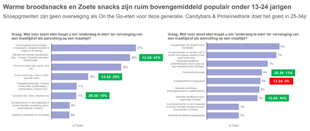 Opvallend is dat er binnen leeftijdsgroepen grote verschillen bestaan. Suurmeijer ziet bijvoorbeeld dat 25- tot 34-jarigen juist vaker grijpen naar candybars en proteïnedranken of -shakes. "Generaties verschillen dus niet alleen van elkaar, maar ook binnen zichzelf."