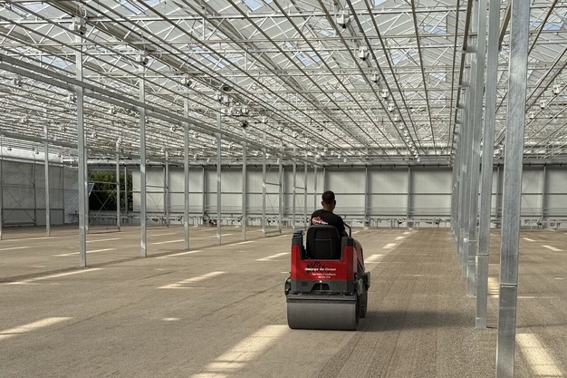 De vloer is essentieel voor telers die werken met eb- en vloedvloeren, teeltsystemen op tafels of precisie-irrigatie. George benadrukt dat lasergestuurd egaliseren directe invloed heeft op zowel de plantgezondheid als de constructieve prestaties van de kas. "Een perfect vlakke kasvloer betaalt zich echt terug," legt hij uit. "Water loopt weg zoals het hoort, waardoor je geen plassen of natte plekken krijgt die ongelijkmatige groei of wortelziekten veroorzaken. In dit project moest de vloer 100% waterpas zijn voor de teeltbanken die later werden geplaatst."
